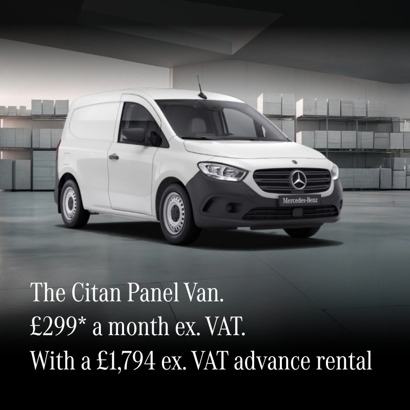 48 Month Contract Hire Agreement. £1,794 excluding VAT customer advance rental. 48 monthly rentals of £299 excluding VAT. 8,000 miles per annum. 9/48 Month payment profile. Contract Hire rentals exlude repair and maintenance. Rentals inlclude Vehicle Excise Duty lease where applicable. Based on a New Mercedes Benz Citan 110 Panel Van L1 BASE. Mileage and damage charges apply.