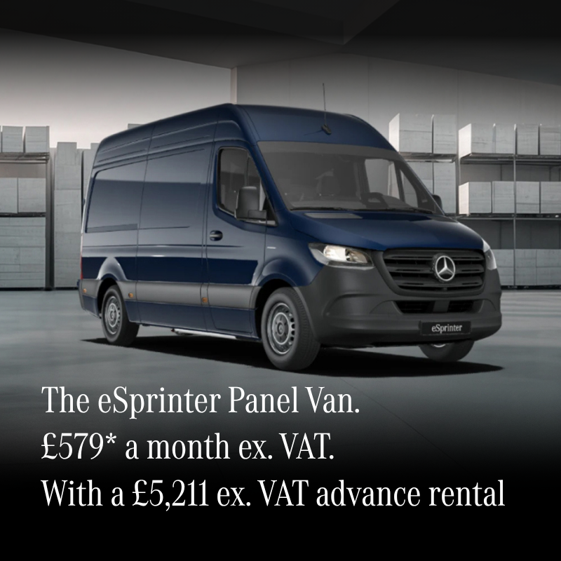 48 Month Contract Hire Agreement. £5,211 excluding VAT customer advance rental. 48 monthly rentals of £579 excluding VAT. 8,000 miles per annum. 9/48 Month payment profile. Rentals include Government OZEV Grant and Vehicle Excise Duty during hire where applicable. Three scheduled services included in the price. Exlcludes the cost of all other repair and maintenace. Based on a New Mercedes Benz eSprinter 314 Panel Van L2 PRO 81kW. Mileage and damage charges apply.